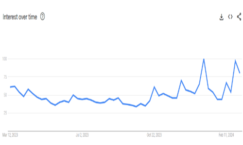 另外,数据显示,3月6号,至少有价值10美元比特币的地址数量创下历史新高,超过3500万。这进一步证明了散户投资者的参与率正在不断提高。随着零售业日益增长的兴趣,比特币的在线搜索趋势也在持续上升。数据显示,在过去的一周里,全球对比特币的搜索量平均达到了80次,较去年同期上涨了31%。当时的价格大约是20000美元。这说明大家对比特币的兴趣依然浓厚。