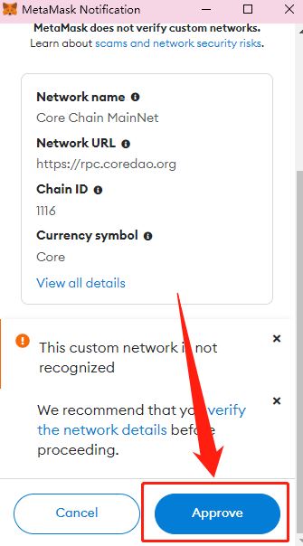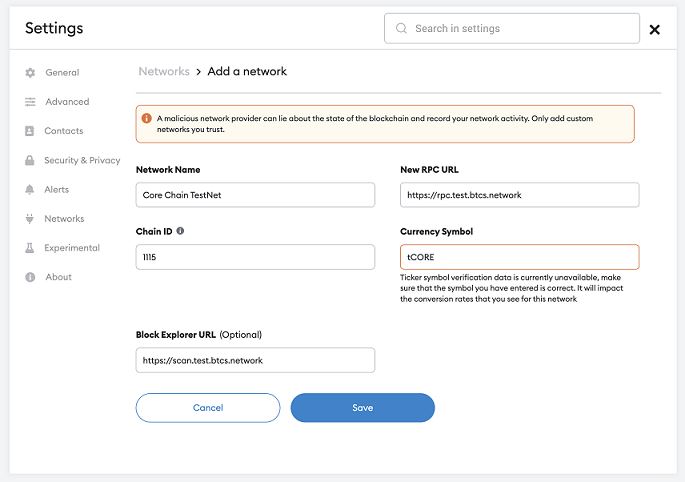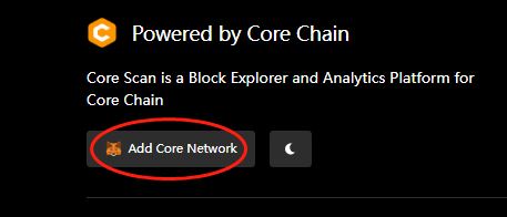 Chrome wallet 用户可使用快捷方式添加网络。访问 scan.test.btcs.network,滚动至底部,点击“添加 Core 网络”按钮。所有网络信息将自动加载到wallet中,只需确认并批准即可。