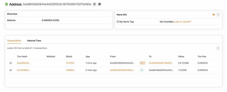 下图展示了从测试网络领取 tCORE 并将其发送到另一个地址的记录:
