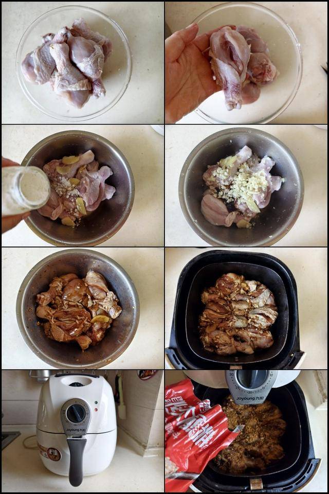 制作:1. 准备好原材料; 2. 在琵琶鸡腿表面上顺着划上3刀; 3. 加入少许盐、淀粉、料酒、蚝油等调味料拌均匀腌制3分钟; 4. 再加入少许蒜末和姜片放进盆中拌均匀; 5. 加盖后放入冰箱中腌制半至1个小时,中间翻动一下以便双面入味; 6. 将腌制好的鸡腿平铺在空气炸锅中; 7. 空气炸锅预热180度,先烤上10分钟; 8. 表面均匀撒上少许烧烤粉,翻面再撒上烧烤粉,继续烘烤5分钟; 重复一遍,再在表面撒上烧烤粉继续烘烤3分钟即可。