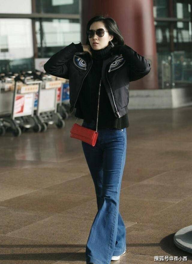 微喇牛仔裤则是拉长比例的关键,大腿修身、膝盖以下渐宽的版型,能够精准修饰小腿线条,而深色牛仔面料自带收缩效果,与黑色毛衣形成了延伸,进一步强化了“上短下长”的黄金比例。这种经典裤型打破了牛仔裤的休闲感,与黑色毛衣搭配时,既有日常随性的松弛感,又不失走路带风的气场,整体搭配完美诠释了“基础款也能穿出彩”。