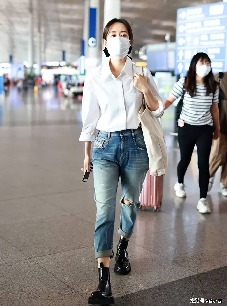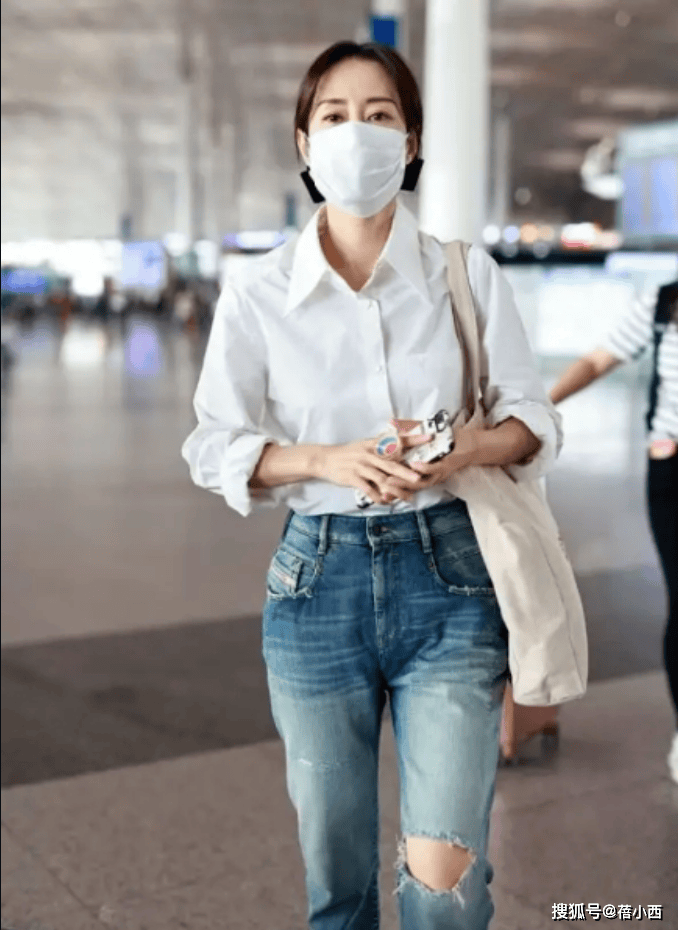 下装的破洞直筒牛仔裤是造型的个性担当,水洗蓝的复古色调自带时尚感,大腿处的破洞设计打破了牛仔的沉闷,增添了几分街头潮酷感,裤脚卷边的细节则让造型更具随性腔调,同时悄悄优化了腿部比例。最重要的是,直筒版型对各种腿型都很友好,既能修饰腿型缺陷,又保留了牛仔的率性本色,与白衬衫形成对冲,让整体风格在知性与酷感间找到平衡。