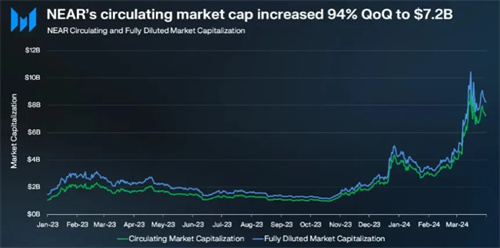 在市值方面,NEAR 的流通市值在 2024 年第一季度也实现了飙升,达到了 72 亿美元,环比增长 94%。