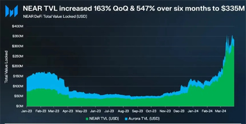 2024年第一季度,NEAR 协议可谓是突飞猛进,各项关键数据都迎来了显著增长。总锁定价值 (TVL) 达到了 3.35 亿美元,环比增长高达 163%,相较于过去六个月更是增长了 547%。这个数字,让人眼前一亮!