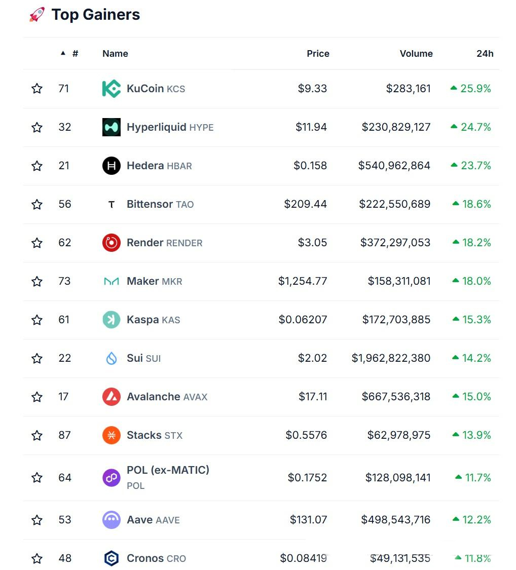 Coingecko的榜单包括:KCS 25.9%,HYPE 24.7%,HBAR 23.7%,TAO 18.6%,RENDER 18.2%,MKR 18%,KAS 15.3%,SUI 14.2%,AVAX 15%,STX 13.9%,POL 11.7%,AAVE 12.2%,CRO 11.8%,TIA 9.8%,LINK 11.7%,DOGE 12.3%,SEI 11.5%,ADA 11.5%,XLM 11%,FET 11.4%,BNSOL 11%,ALGO 10.6%,BONK 10.1%,ENA 9.9%,ONDO 11.5%,XRP 10.3%,BGB 11.7%,VET 10.5%,LTC 9.9%,GRT 9.5%。