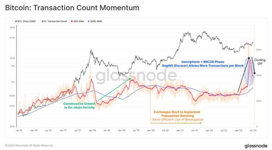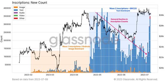 然而,根据区块链分析公司GLASSNODE发布的最新周报显示,比特币铭文的热度正在逐渐消退。报告指出,比特币铭文经历了两个主要的浪潮: