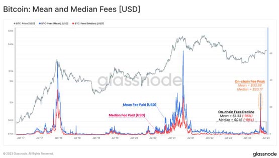 自5月份BRC-20热潮达到顶峰以来,以美元计价的比特币交易费用大幅下降,目前平均费用仅为1.33美元,费用数降至0.16美元。