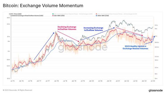如果只看交易所的资金流入和流出,会发现比特币网络正进入一个积极的时期。目前,月平均交易所流量明显高于年平均数据。从资产的角度来看,这一迹象表明比特币的采用率正在不断提高。