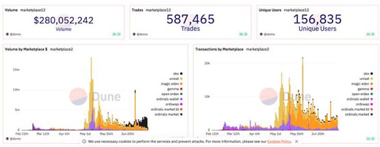 根据Dune Analytics的数据,自7月以来,[OKX](https://okx.4k6k.com/oe.html)正在逐步取代UniSat和Magic Eden,成为Bitcoin Ordinals二级市场交易额的领先平台。OKX铭文交易额的市场占有率从6月底的30%-40%迅速增长到本周的80%以上。