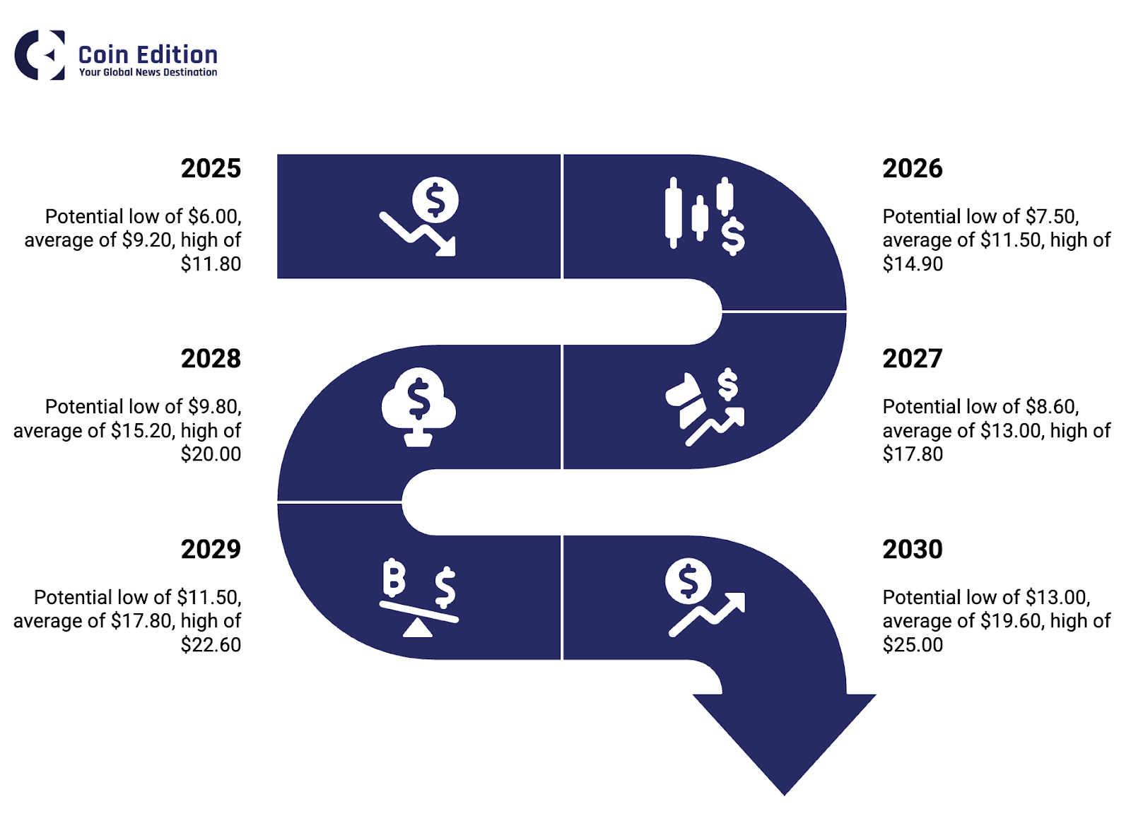到 2030 年,DEXE 可能会重回其历史最高价位,并有可能测试 25 美元。该项目的 DAO 治理模式和采用指标对于维持其长期价值至关重要。如果开发进度持续推进,且新的集成支持代币实用性,预计平均价格在 19.60 美元左右是合理的。
