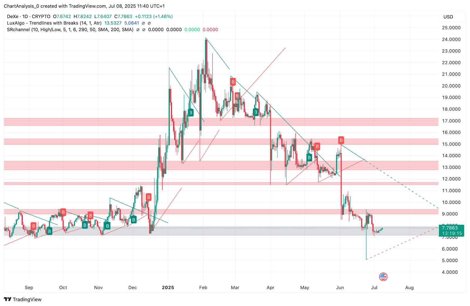 DEXE 今日价格在 7.77 美元附近交易,自 6.10 美元附近的主要支撑位反弹。自 2023 年以来,该区域一直是强劲的反转区域。
