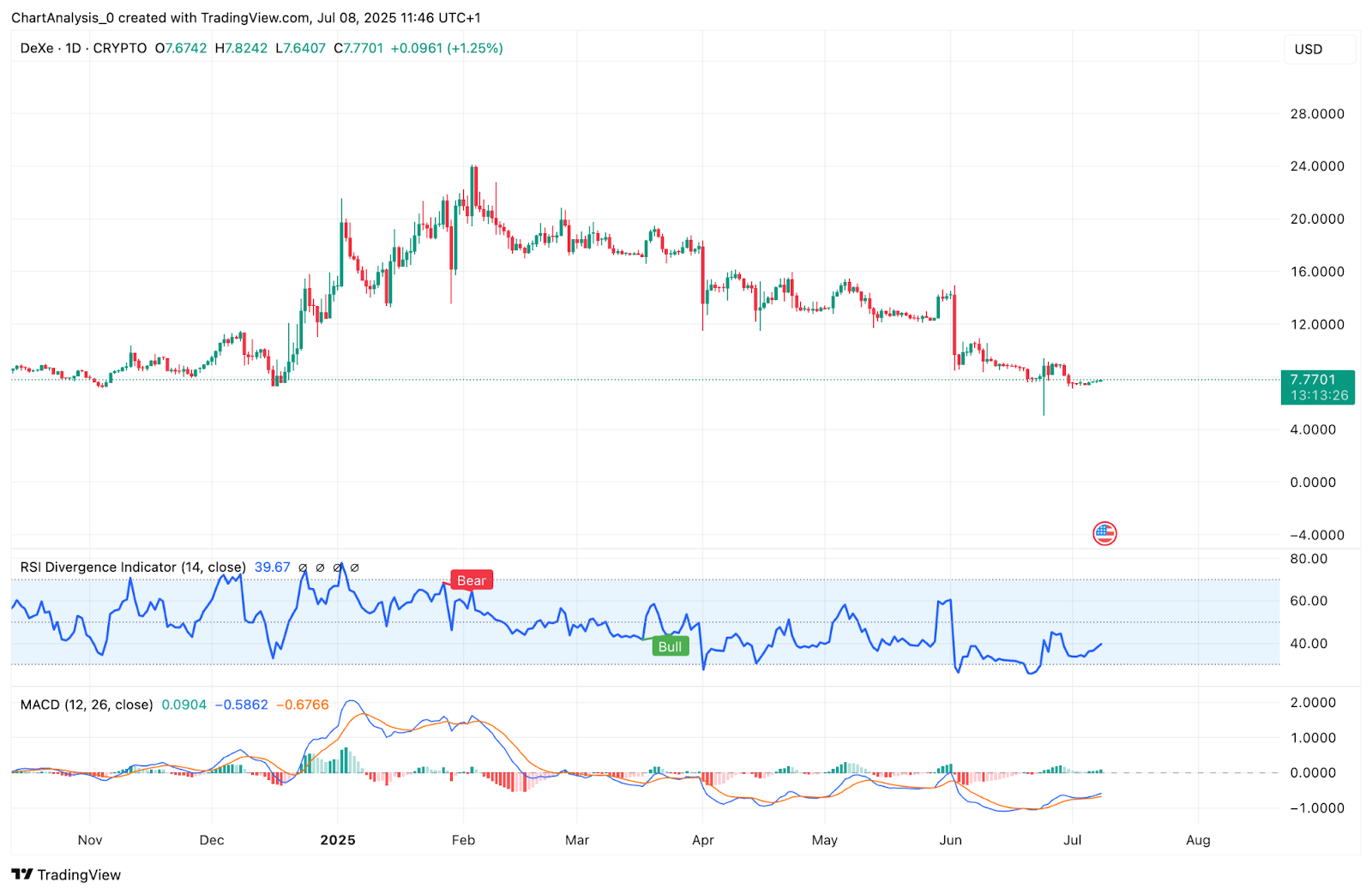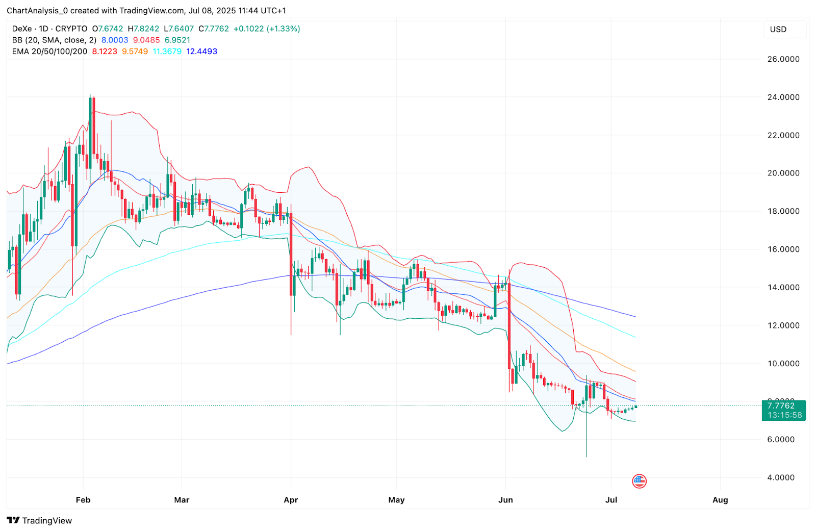 在日线图上,DEXE 仍然受困于长期下降趋势线之下,但近期价格走势正在形成略高于 7.60 美元的短期基础。