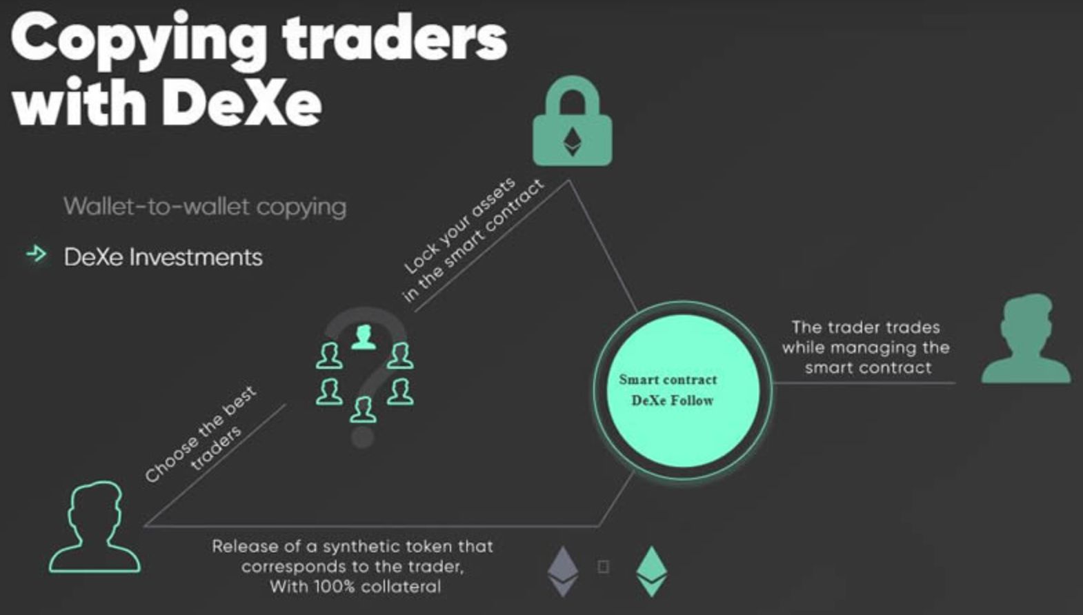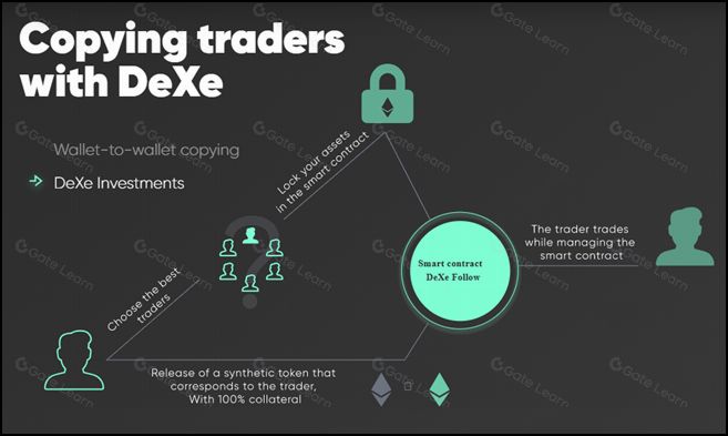 DeXe 用户可以利用账户资讯工具来选择关注哪个交易者,用户将其资产锁定到与「DeXe Follow」智能合约连结的智能合约中,这将释放一个完全抵押的合成代币,其价值与交易者相对应,代币以实体资产作为抵押,而其价值取决于交易者的技能,交易者继续照常交易,同时管理 DeXe Follow 合约。