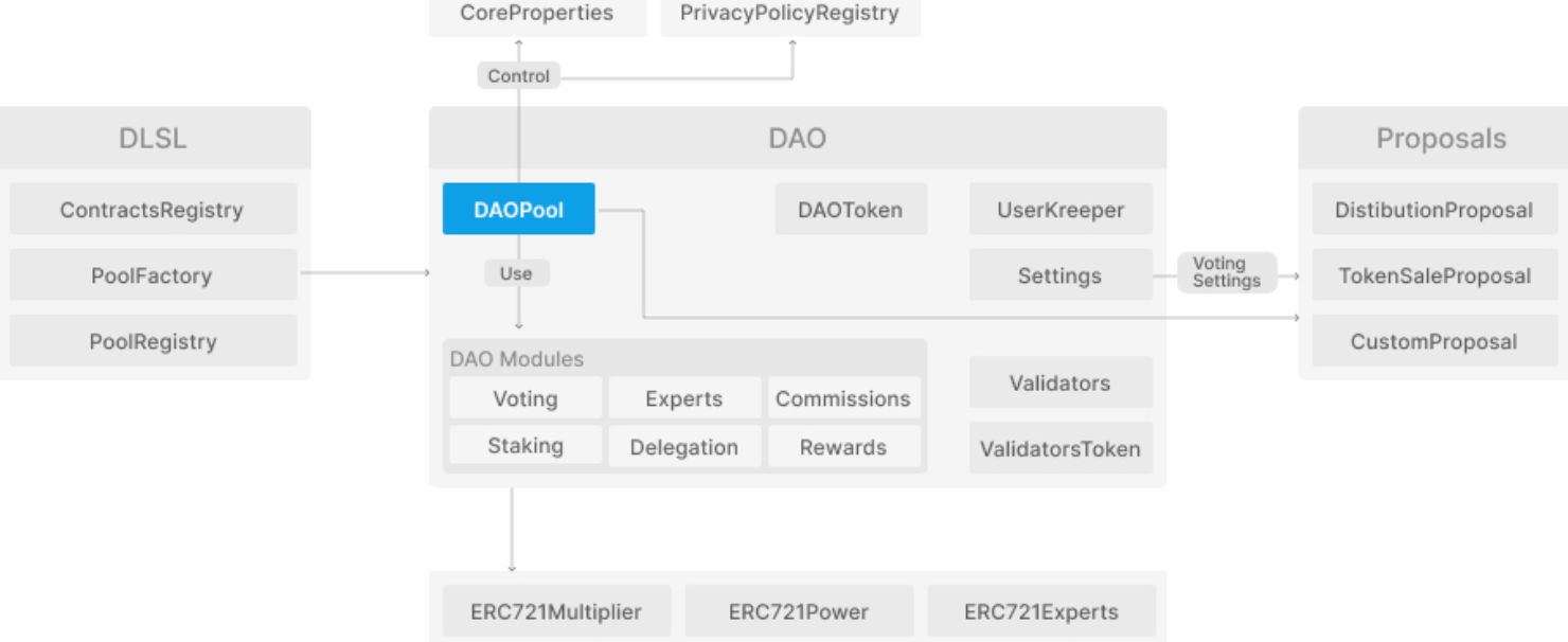 池中代币决定 DAO 社群的成员资格,授予用户投票权和参与集体决策过程的权利,代币持有者可以提出可由其他 DAO 成员(即治理)批准或拒绝的想法。以下的方案显示了构成我们基础设施的各种智慧合约区块的高级概述:
