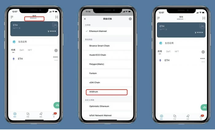 下载完成后,在wallet顶部的菜单中切换至 Arbitrum 网络。