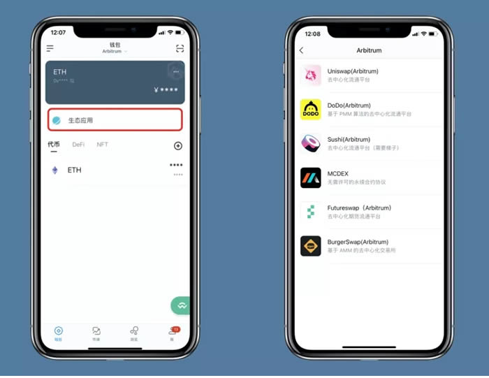 点击“生态应用”,探索 Arbitrum 生态中最受欢迎的 DApp,直接在 imToken 的 DApp 浏览器中使用。