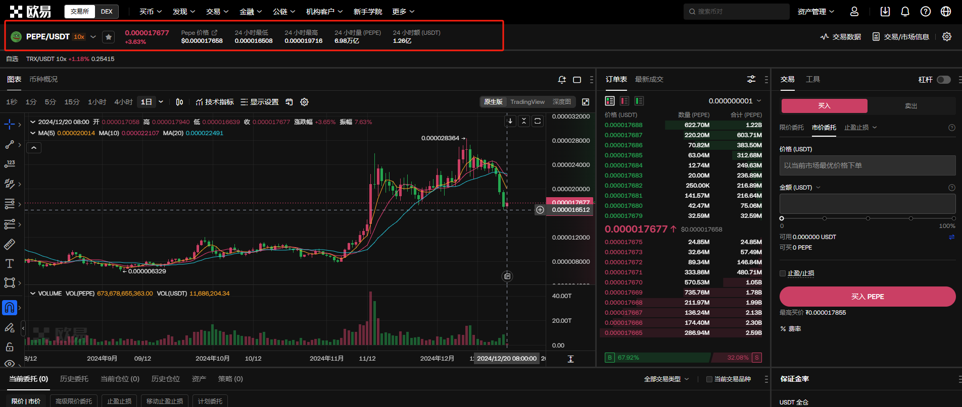 在过去24小时内,pepe的成交量达到了7.10万亿枚,成交额为1.28亿美元,市值约为75.29亿美元。在欧意交易所,pepe的热度排名第七,市值排名第24,自选用户比例为16.61%。