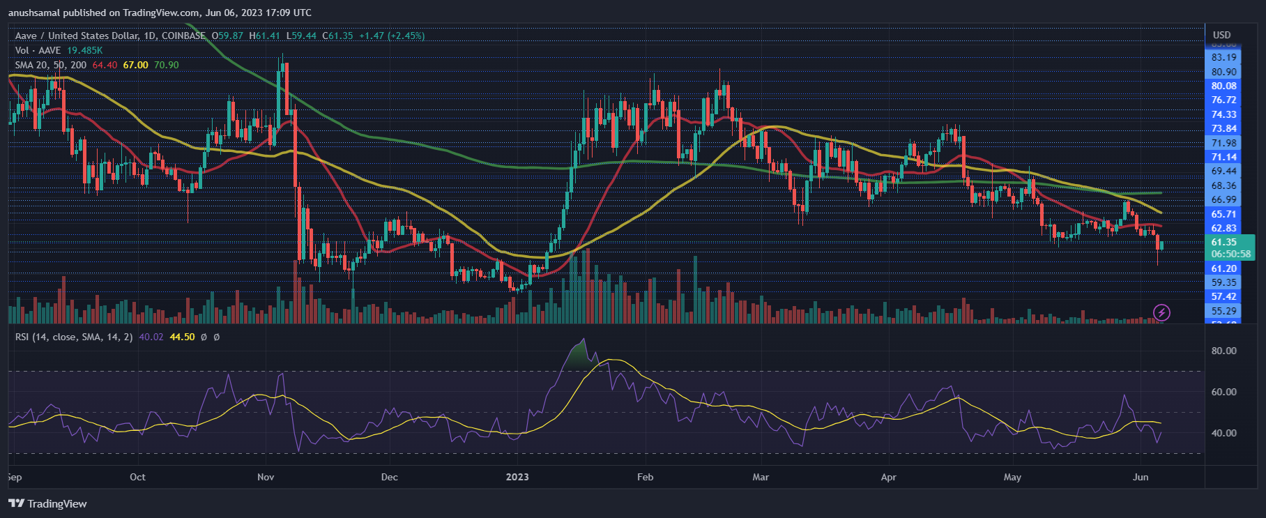 为了保持购买力,价格需要超过上方阻力位。此外,Aave 已跌破 20 条简单移动平均线,表明卖家一直在推动市场的价格势头。这些因素表明围绕 Aave 表现的普遍看跌情绪。