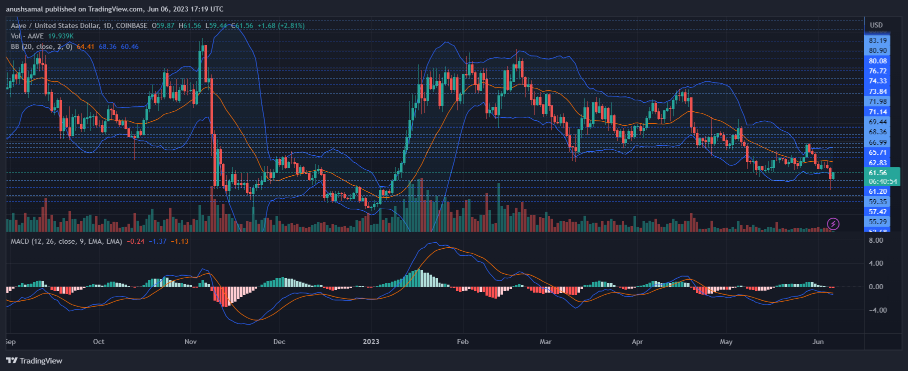如果价格突破 62.80 美元,则可能达到 65 美元的价格水平。然而,空头已经产生影响,这可能导致 Aave 接近其支撑线 59 美元。