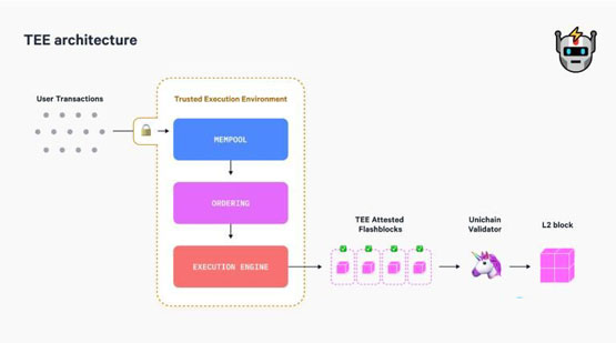 Unichain 将区块生成器的角色与排序器分离,使用与 Flashbots 合作开发的可验证区块构建器。区块构建操作在 Intel 的 TDX 硬件上运行开源构建代码库中执行。TEE 通过可证明的、超便宜的链下执行取代链上逻辑。虽然 TEE 并不能取代去中心化共识,但相对于其他区块生成器,它有更强的信任和安全性。