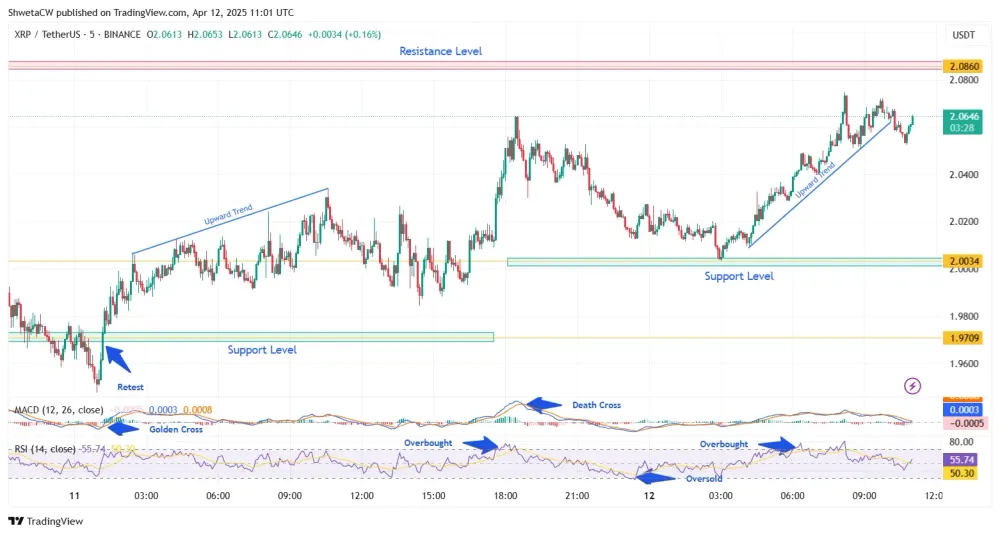 截至2025年4月13日,XRP的交易价格约为2.05美元,技术分析显示,XRP目前的价格介于2.0860美元的阻力位和2.0034美元的支撑位之间。
