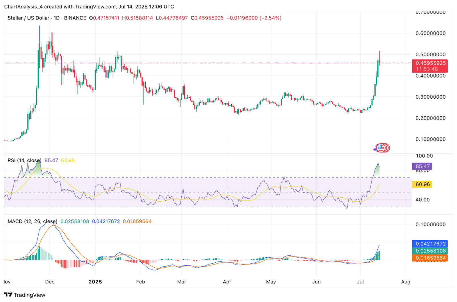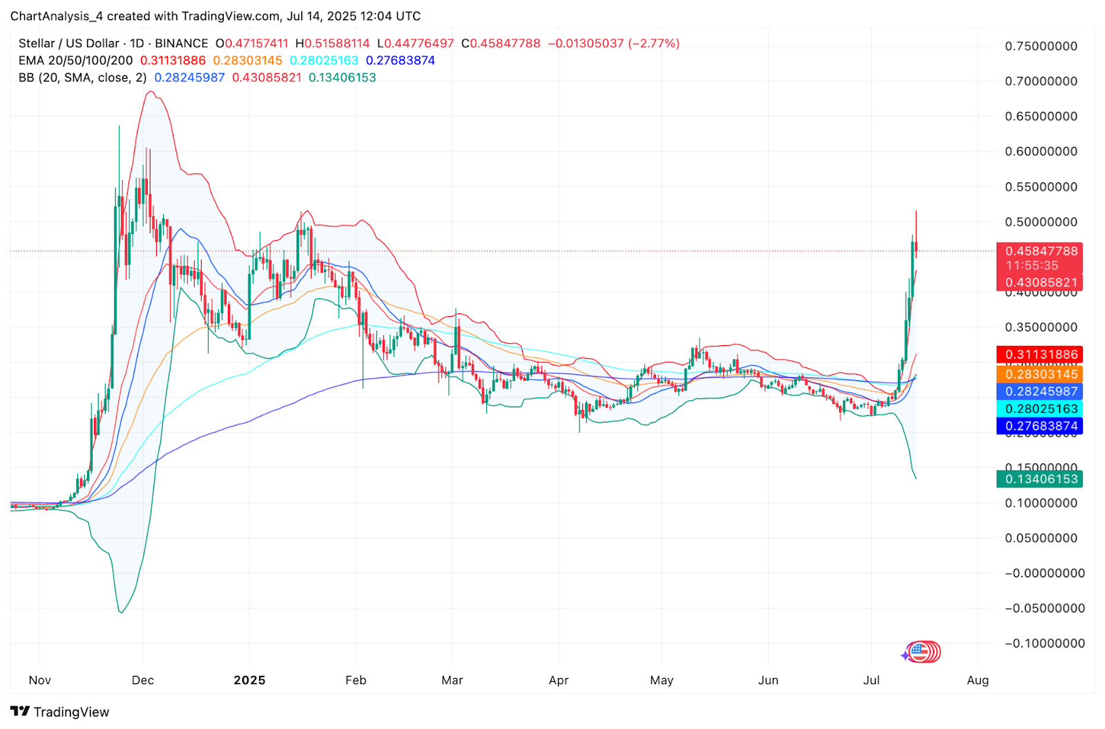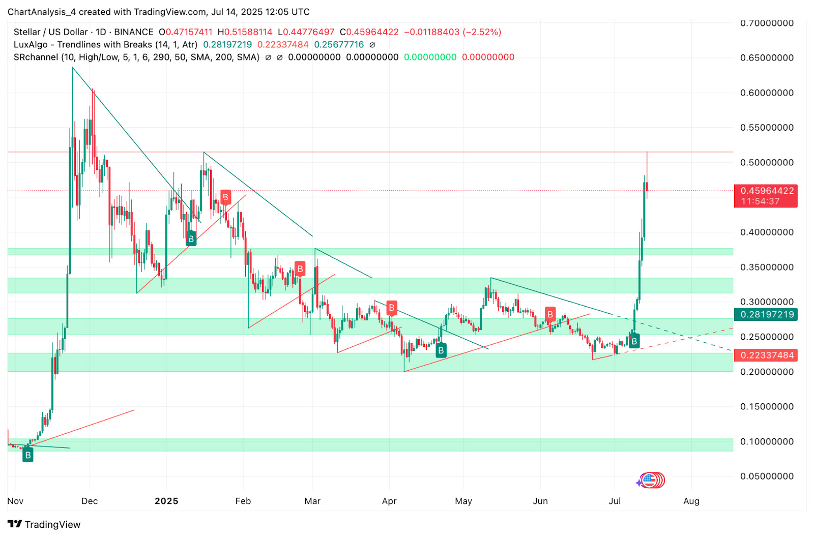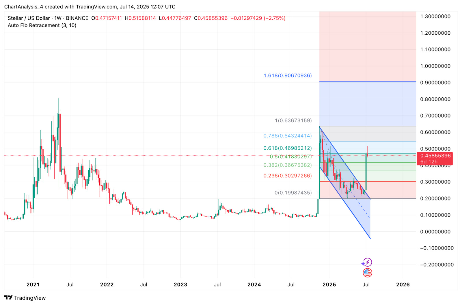 目前,恒星币价格在 0.458 美元附近徘徊,此前曾一度触及 0.515 美元的高点。这波上涨是在突破周线图上的下降楔形后发生的,并且成功突破了 0.618 斐波那契回撤位 0.469 美元。从日线图来看,在突破 0.22 美元至 0.28 美元的累积区间后,市场结构发生了显著变化。