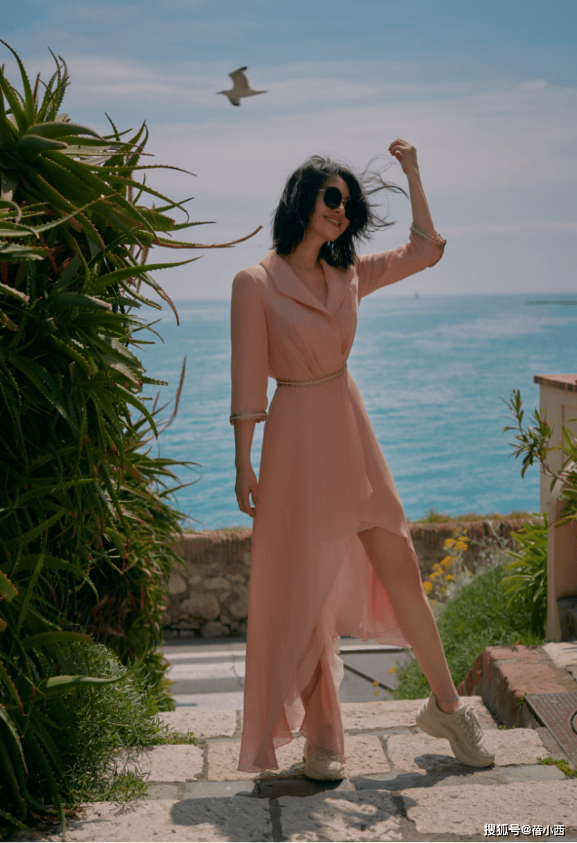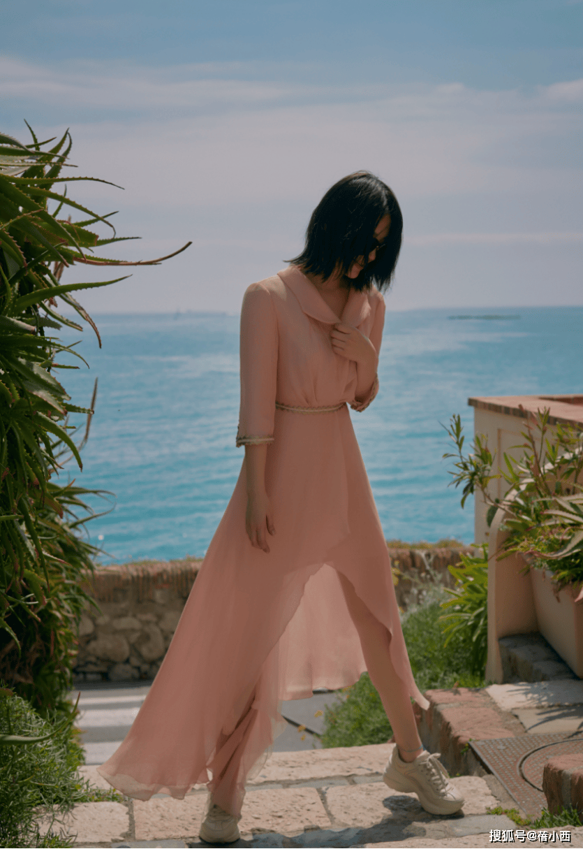 粉色连衣裙上身后十分减龄,领子融入翻领设计,同时具有恰到好处的露肤度,所以脖子不仅可以保持清爽,也显得脖子更修长了。袖子长度是一大亮点,七分袖子在夏天十分常见,不光会出现在连衣裙上,T恤也常采用此种袖长。只要面料轻薄透气性好,在炎热夏季能起到一些防晒效果。
