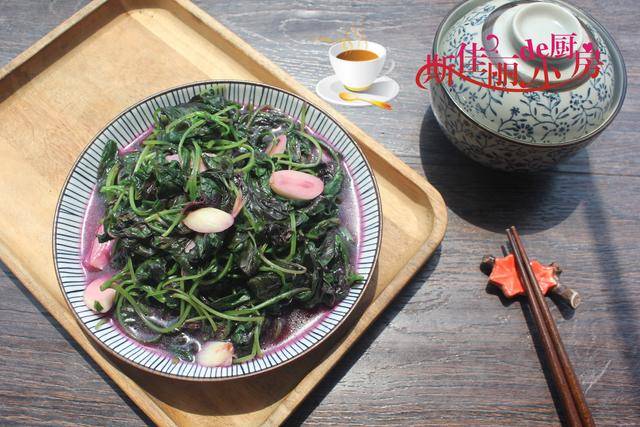 第五道菜: 蒜蓉炒苋菜,餐桌上少不来素菜,一道用苋菜制作的家常素炒菜,色泽艳红,寓意着”生活红红火火“。