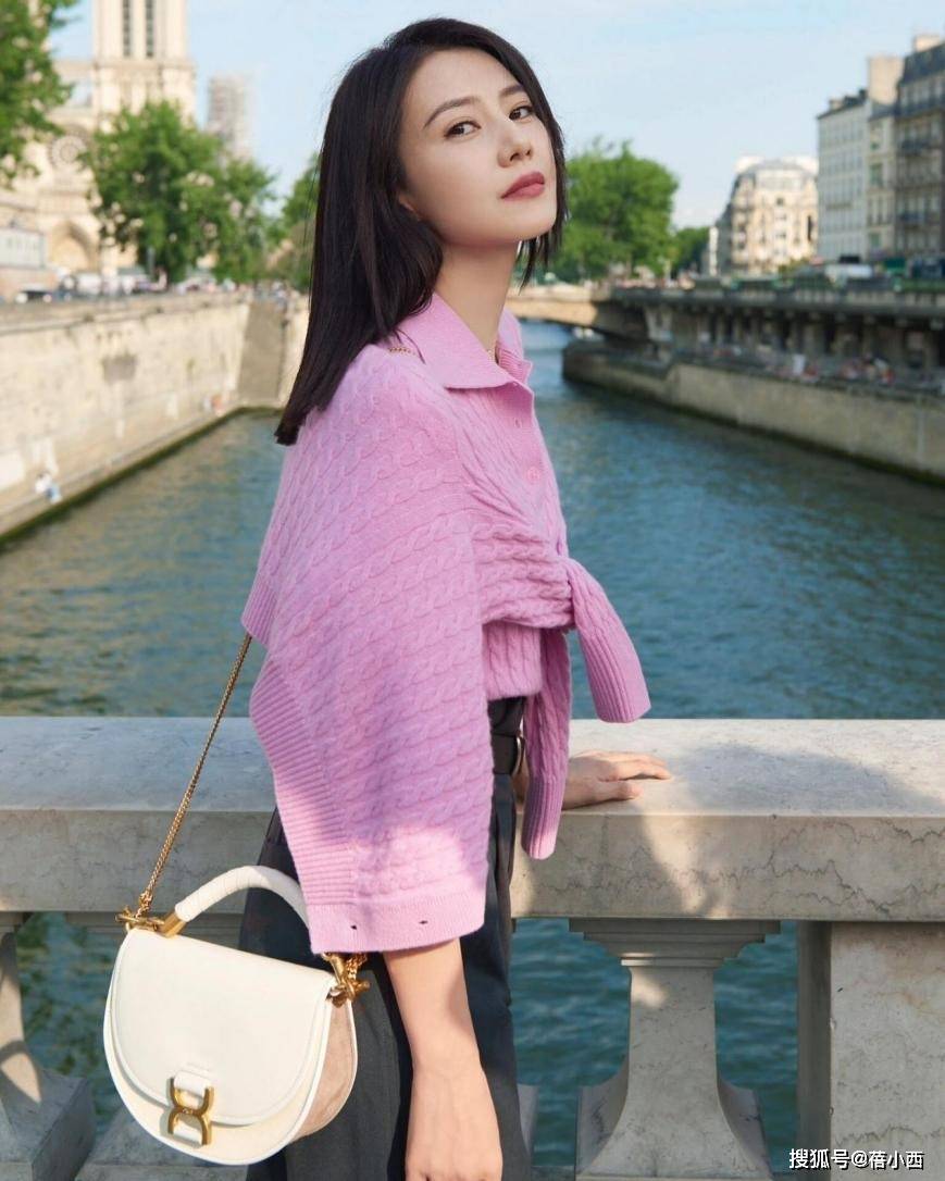 仔细观察后发现,上半身是两件套,里层极有可能是短袖,披在肩上的是外套,只是将两条袖子系了起来。这种“不按常理出牌”的穿搭技巧让人眼前一亮,时髦度也增高了。粉色系衣服受欢迎的重要一点是,其分分钟让穿着者年轻15岁不止,当然了,白肌肤与粉色外套适配度更高,衬得人更娇嫩了。