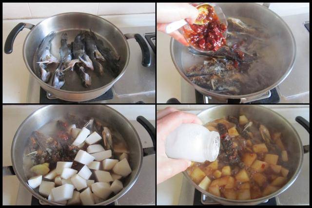 推荐菜谱【 白萝卜炖黄骨鱼】 原料: 白萝卜 黄骨鱼 姜片 郫县豆瓣酱 料酒酱油葱花 油盐