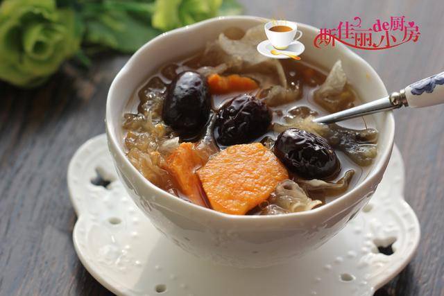 三、银耳:银耳是滋阴润燥的佳品,也是天然的养颜品,寒露时节天凉且气候干燥, 银耳不仅能滋阴养肺,还能滋润皮肤,缓解干燥和瘙痒等不适,在享受美味的同时,还让你变得更漂亮。 用银耳来炖煮甜品,配料中加入少许红薯和红枣,营养更足,口感更丰富,特别适合秋季进补润燥。