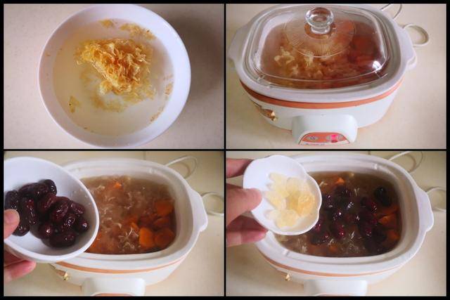 制作过程: 提前将银耳用冷水泡软,手撕成小片备用。红薯去皮后切成块,注意块不用切的太小,避免过于软烂, 将准备好的银耳片、红枣和红薯块放入电炖锅, 加入适量的水, 加盖炖煮1个小时,炖煮好后加入少许冰糖融化即可。