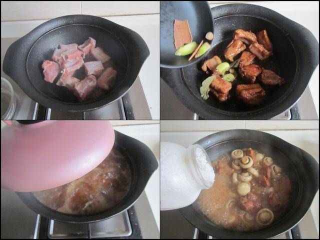 制作过程: 烧热锅放入少许油,加入1勺冰糖放进锅中不停地翻炒,炒至冰糖融合呈棕色后加入泡好的排骨放进锅中翻炒上色,加入姜片和桂皮等大料放进锅中翻炒几下, 加入料酒和酱油翻炒均匀,再加入适量的水,加盖焖煮二十分钟,再加入口蘑放进锅中继续焖煮五分钟, 最后加入少许盐调味,大火收汁后撒入少许葱花即可。