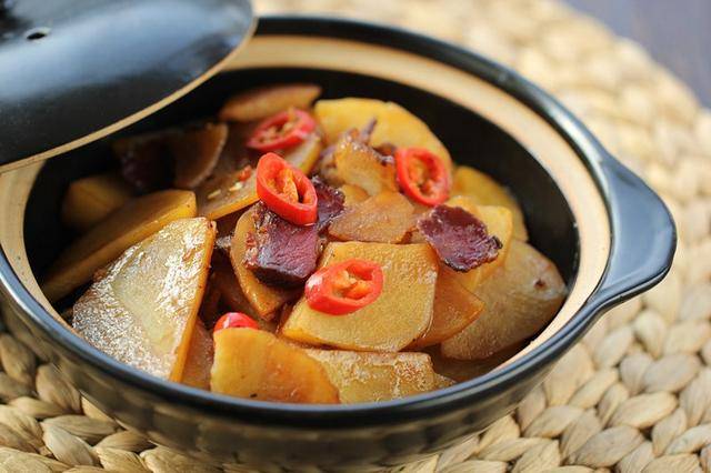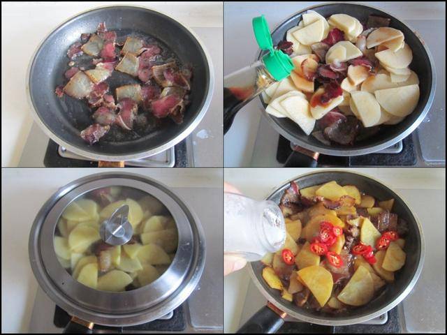 制作过程: 将腊肉用热水清洗干净后切成片备用; 土豆切成片备用; 烧热锅放入少许油,将腊肉片和少许水焖煮两、三分钟后再微微腌制油脂,加入准备好的土豆片放进锅中翻炒两下,加入1勺生抽翻炒均匀,加入少许水加盖焖煮两分钟,加入适量的盐和红椒圈放进锅中翻炒均匀即可。