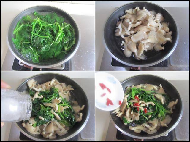 制作过程: 烧锅开水,加入少许盐和几滴油, 将菠菜放进锅中焯汤变色后捞出备用,这样能去除菠菜中所含的草酸; 烧热锅放入适量的油,加入平菇进锅翻炒至八、九成熟,加入焯好的菠菜放进锅中翻炒两下,加入少许盐调味,最后放入泡好的枸杞进锅翻炒均匀即可。