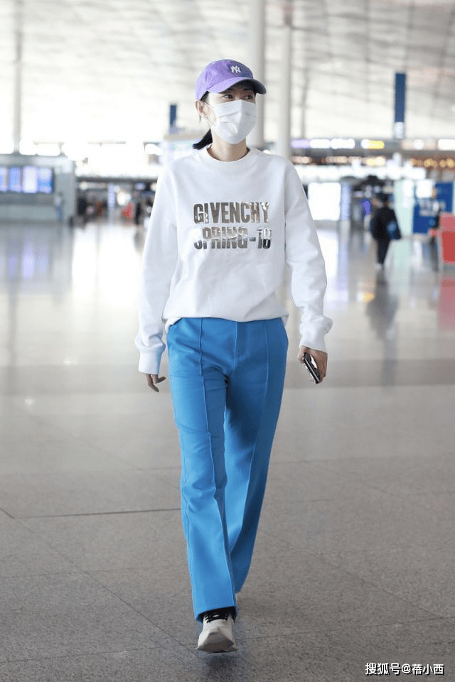 下身搭配的蓝色运动裤,颜色特别亮眼,一下子就抓住了人们的目光。运动裤是直筒的版型,宽松舒适,让腿部线条看起来格外利落,整体白色卫衣与蓝色运动裤的组合清新又亮眼,就像把蓝天与白云穿在了身上,充满了春日般的活力与朝气。