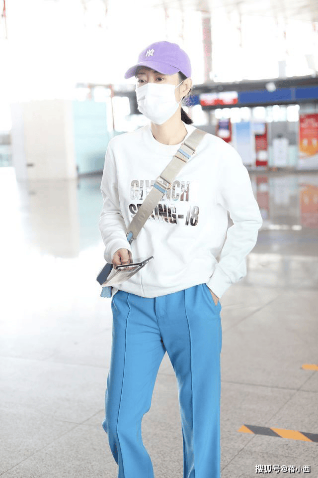 头上戴的紫色棒球帽也为整体造型增添了一抹亮色,打破了白蓝搭配的单调感,多了几分俏皮与个性,再看脚上的运动鞋,款式简约舒适,很适合机场出行的场景。