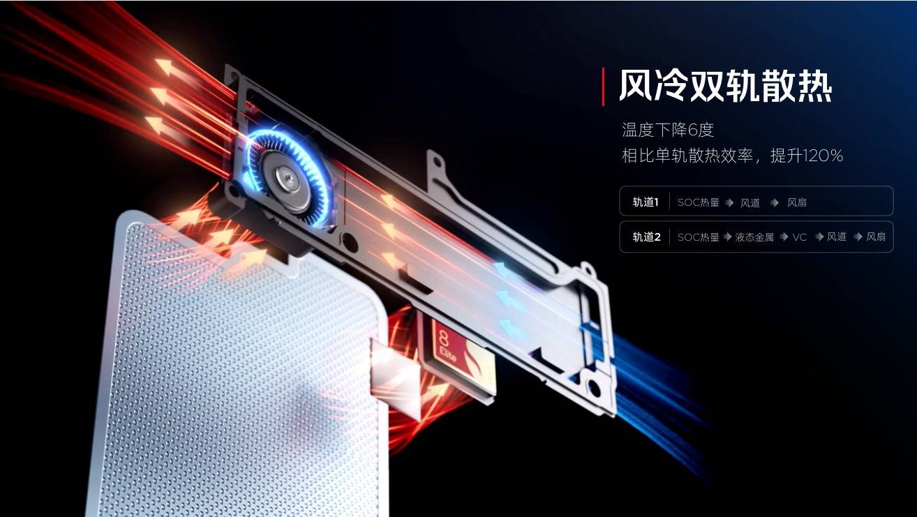 并且此次红魔还带来了全新的散热系统——风冷双轨散热,通过大风道贯穿式散热设计,在快速排出机身内热量的同时,部分热量也能经由液态金属传导至VC均热板,并传导至风扇,相比单轨散热效率提升了120%。