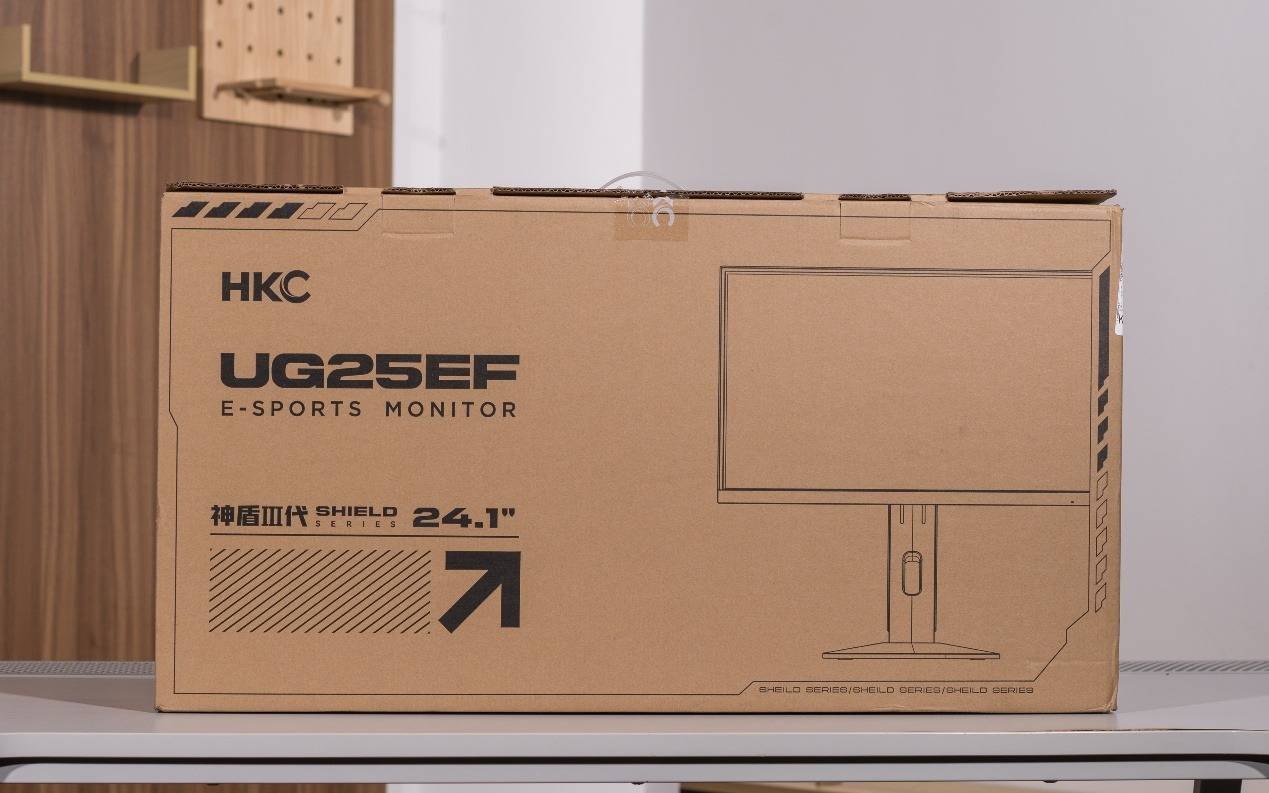 在进行详细的评测之前,让我们先对产品进行一个简单的开箱,这台HKC UG25EF的包装整体设计较为简约。使用了原色瓦楞纸作为外包装包材,包装上印有产品名称,外观简图和所属系列。