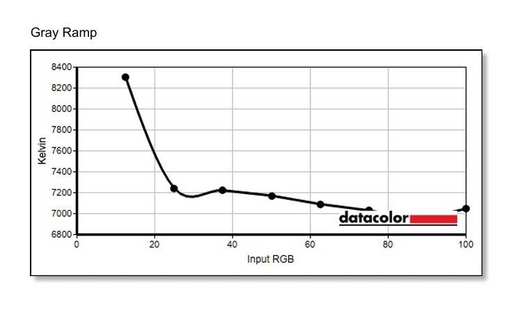 灰阶表现方面,HKC UG25EF的色温曲线在不同灰度下有较为明显的波动,整体在 7000K 至 8300K 之间浮动,但波动的曲线相对平滑 。