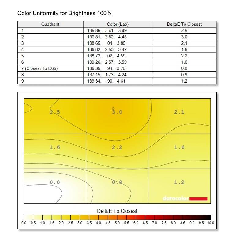 在100%亮度下,HKC UG25EF的色彩均匀性相当出色,最接近D65标准的区域为7号区域,而其他区域与7号区域的最大差值ΔE只有3.0,为屏幕上方中央的的2号区域,这样的测试结果证明,在显示画面时,HKC UG25EF的色彩一致性极高。