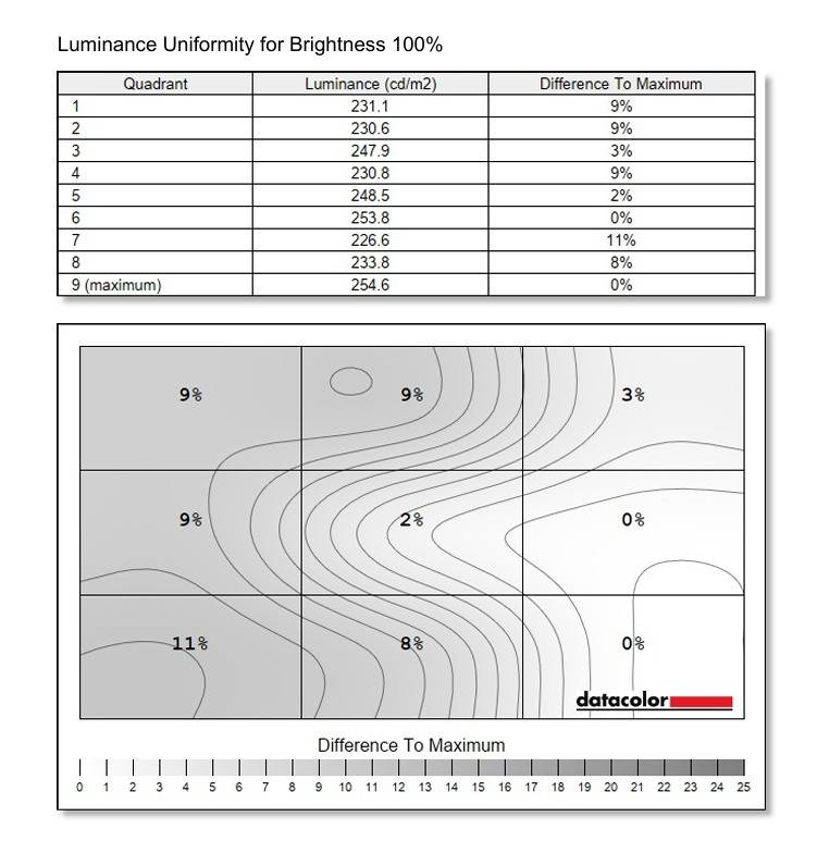 至于亮度均匀性方面,HKC UG25EF的表现还算不错,在100%的最大亮度下,HKC UG25EF的屏幕表现为左侧整体偏亮,其中最大的亮度偏差区域出现在屏幕左下角,差值为11%。