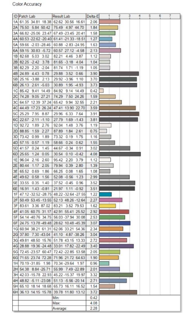 色准方面, HKC UG25EF 的表现则较为一般。在预设模式下,其平均ΔE值约为 2.28,最大 ΔE 值达到4.08。考虑到HKC UG25EF是一款专注于超高刷新率和响应速度的超高刷电竞显示器,这样的色准表现仍在可接受范围内,其主要优势仍在于极致的动态性能。