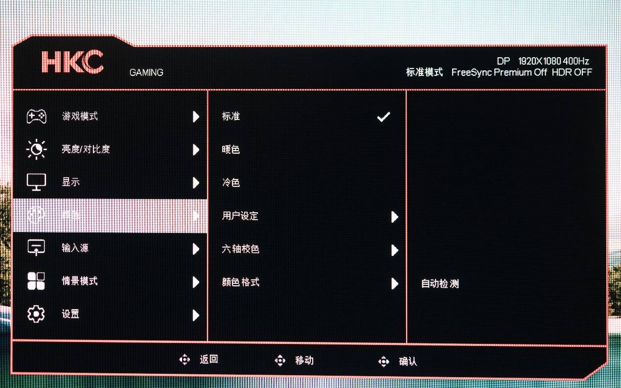 最后让我们来看看HKC UG25EF 的OSD菜单设计,HKC UG25EF的OSD 菜单沿袭了 HKC 传统的黑红风格。搭配显示器背面的五向摇杆式按键即可进行方便的盲操。