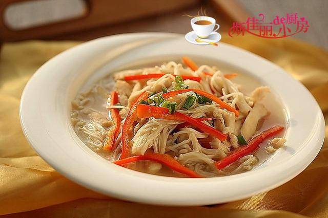 推荐菜谱【金针菇炒鸡丝】 原料: 金针菇 鸡胸肉 红辣椒 料酒 生抽 淀粉 油盐