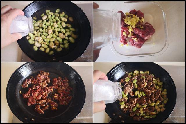 制作过程: 烧锅水加入少许盐和几滴油,将蚕豆米放进锅中焯煮三分钟后捞出备用。 牛肉片加入少许盐、淀粉、料酒和生抽等调味料拌均匀腌制3分钟备用。 烧热锅放入适量的油,加入腌制好的牛肉片放进锅中翻炒至变色,加入焯好的蚕豆米放进锅中翻炒几下,加入少许盐调味,翻炒均匀,注意蚕豆米一定要炒熟了吃,避免吃不熟的蚕豆米中毒。