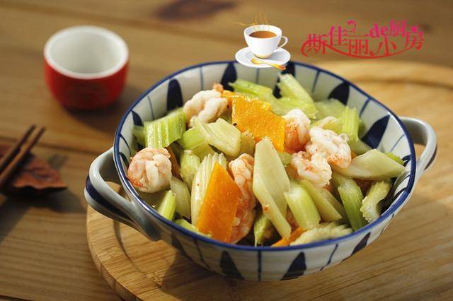 制作过程:鲜虾去壳后挑出虾线,洗净后挤干水分,加入少许盐、淀粉和料酒拌均匀腌制3分钟备用。 烧锅水加入少许盐和几滴油,将南瓜片和西芹片放进锅中焯煮两分钟捞出备用。热锅凉油,将虾仁放进锅中翻炒变色,加入西芹片和南瓜片进锅翻炒几下,再加入少许盐调味,最后加入少许水淀粉勾芡即可。