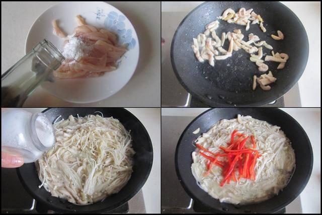 制作过程:将金针菇切出根部洗净备用; 鸡脯肉和红椒切成丝备用。 鸡肉丝加入少许盐、淀粉、料酒和生抽等调味料拌均匀腌制3分钟备用。 烧热锅放入少许油,加入蒜丝放进锅中煸炒香,将鸡脯肉丝放进锅中煸炒至变色, 加入金针菇放进锅中翻炒几下, 再加入少许盐调味,最后加入准备好的红椒丝放进锅中翻炒至变色,盛入盘中撒上少许葱花即可。