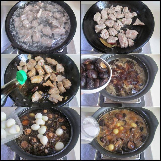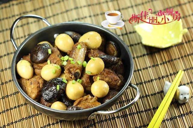 制作过程: 将香菇用冷水泡软备用; 鹌鹑蛋煮熟后去壳备用; 排骨剁成麻将大小的块备用。 烧锅水加入少许姜片,将排骨冷水下锅焯水,焯出浮沫后捞出备用; 烧热锅放入少许油,加入少许冰糖进锅翻炒直至冰糖融化, 加入焯好的排骨放进锅中煸炒几下,再加入姜片和八角等大料放进锅中翻炒几下, 加入少许料酒和酱油翻炒均匀; 将其放入炖锅中,加入泡好的香菇和泡香菇的水,大火煮开后转为小火炖煮20分钟, 再将煮好的鹌鹑蛋放进锅中去煮,加入适量的盐和胡椒粉调味,煮上5分钟后大火收汁,盛入钵中撒上少许葱花即可。