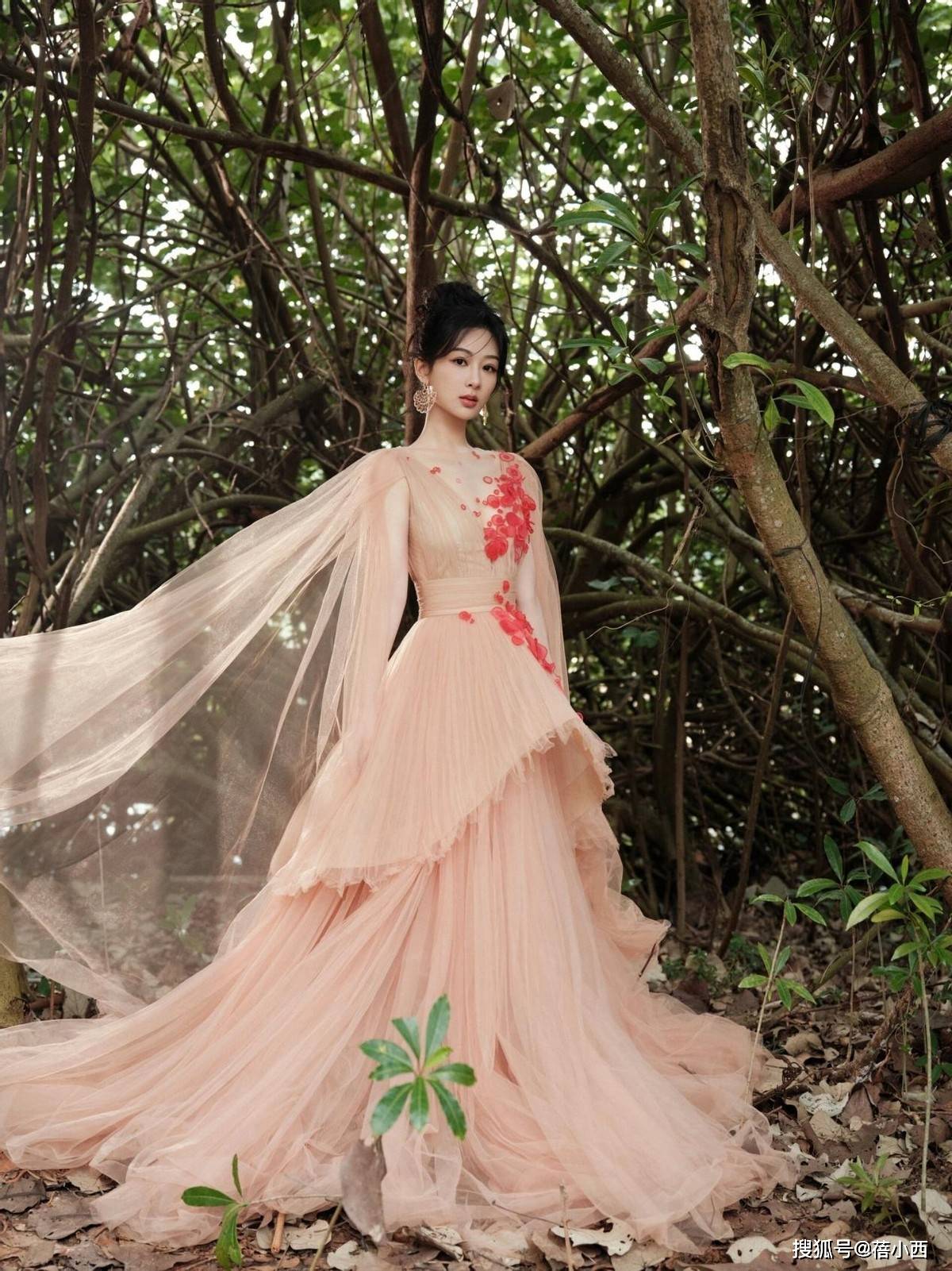 再看款式设计,这件纱裙采用了极具层次感的剪裁,上身部分贴合身形,勾勒出杨紫玲珑的曲线,尤其是精致的领口设计,恰到好处地露出优美的脖颈线条,增添了几分小性感。而自腰部开始,层层叠叠的纱质裙摆如云朵般散开,营造出一种轻盈飘逸的氛围。